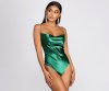 You're all about that satin trend this season! This bodysuit features a sleeveless bodice, bungee spaghetti straps, a cowl neck, a square back, and a thong bottom with dual snap button closures. The satin-like fabric offers an ample amount of stretch and a form-fit.