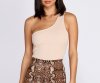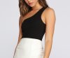 Ready to add another essential to your gotta-have roster? Then behold your next bodysuit! It features all-over ultra-slim ribbing, an off-shoulder neckline with single, wide tank-style strap, a thong-style bottom, and two-button snap closure. Bodysuit is made from a densely woven knit with moderate stretch.